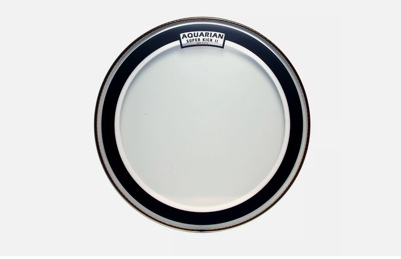 El parche para bombo Aquarian Super Kick II utiliza dos capas de 7 milésimas de pulgada de película de parche de bombo NEW BRITE y cuenta con el Sistema de amortiguación flotante patentado de Aquarian .