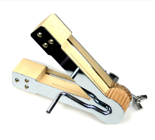 Una rueda de madera y cuatro lengüetas de madera que están montadas entre soportes de acero. Todas las partes metálicas están niqueladas.